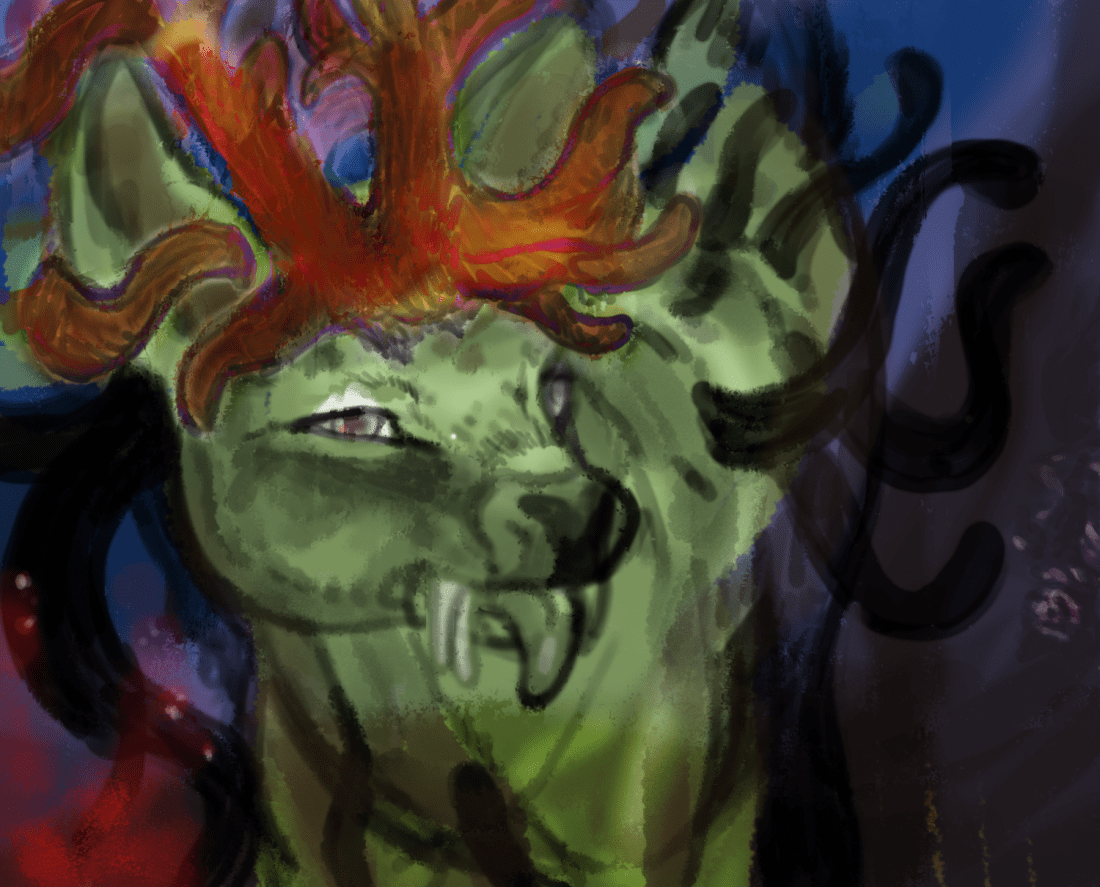The trail lingered wherever she went. Tentacles skidding, the beast lurched forward. What once was a deer; now a disfigured and corrupted beast. The thick strand trailed behind her, leaving a path of putrid slime and decay. Pushing onward; bringing death to all that crossed it. No mind given to the plant and flesh matter that crossed it. A poor cat; mangled and torn to pieces. Its bones were spit out and sank into the newly created corroding mire. Yet another unfortunate soul. The beast continued on its path instinctively. She looked down at the ground, hunched. A weighted, chaotic, mass of antlers had grown over her head. She once tried, but the beast couldn’t save them from themselves.